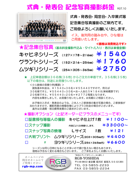 <集合写真の基本料金> 36名様以上の単価です。(36枚以上のご注文の単価)