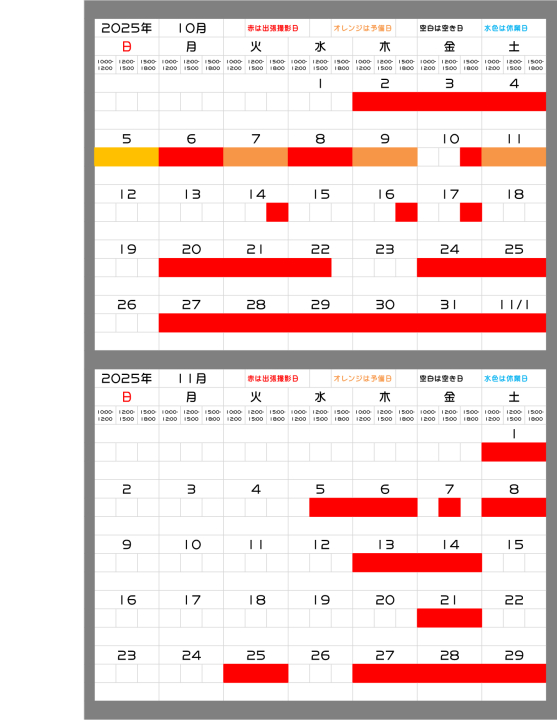 撮影等のご依頼をいただいている日時を表したカレンダーです。